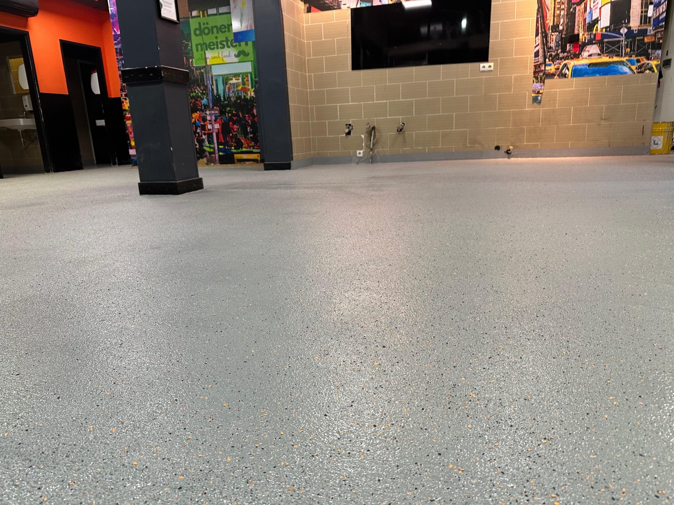 Für dieses Projekt haben wir den Boden einer stark frequentierten Döner-Bude komplett erneuert. Der alte Belag war abgenutzt und schwer zu reinigen – daher fiel die Wahl auf einen robusten Epoxidharzboden.